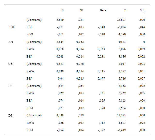 Regarding universal health, ESJ and SDO were found relevant. There is a negative relationship between people who are SDO / ESJ and support for the health system, which means that people believe that the system should not be egalitarian, free and universal.