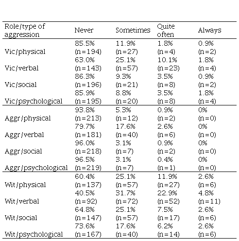 Table 1 shows that as victims, verbal aggression is by far the most common form of aggression suffered (37% verbal aggression vs. 14.6% physical aggression, 13.7% social aggression and 14.1% psychological aggression). As regards aggressors, the use of verbal aggression is also detected as the most common method to harass their peers (20.2% verbal aggression vs 6.2% physical aggression, 4% social aggression and 3.5% psychological aggression). Both social and psychological aggression present much lower values than the other two types. In respect of witnesses, the data on aggression are alarming for all modalities, but once again it is verbal aggression that is most commonly seen by witnesses (59.4% verbal aggression vs 39.6% physical aggression, 35.2% social aggression and 26.4% psychological aggression).