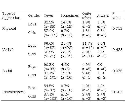 In the cross between bullying and gender, no significant differences were found in any of the questions. However, when asked as victims whether they had been assaulted or molested using social aggression, there was a small tendency for girls to suffer more social aggression (16.9%) than men (9.8%) ( Table 2).