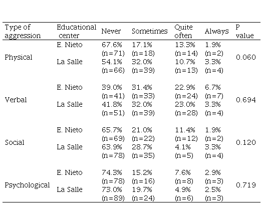 In the crossover between bullying and the type of educational center (public or semi-public), no significant differences were found for any of the questions asked. However, in the question to witnesses about whether they saw a colleague being physically assaulted or disturbed, a clear tendency was detected that these physical aggressions were observed more often in the semi-public La Salle educational center (46%) than in the Enrique Nieto educational center (32.3%) ( Table 3).