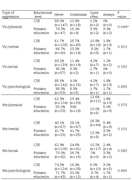 Cerezo ( 2009, p. 392) states that ?the most common forms of abuse are insults and threats, followed by physical violence in primary school and social exclusion in secondary school?. Our data coincide with those of the aforementioned research, since we found a clear tendency for primary education students to witness physical aggression in greater numbers than secondary education students. Likewise, Polo del Río, Léon del Barco, Felipe, Gómez and López Ramos ( 2011) affirm that situations of harassment occur more frequently in semi-public schools than in public schools, as also corroborated by our study. Furthermore, these results are complemented by those obtained relating to victimization because it was observed that there were more victims of physical assault in the sixth year of primary education than in the CSE. On this point, our findings agree with the study carried out by Cano and Vargas ( 2018) who observed the same differences between the stated educational levels.