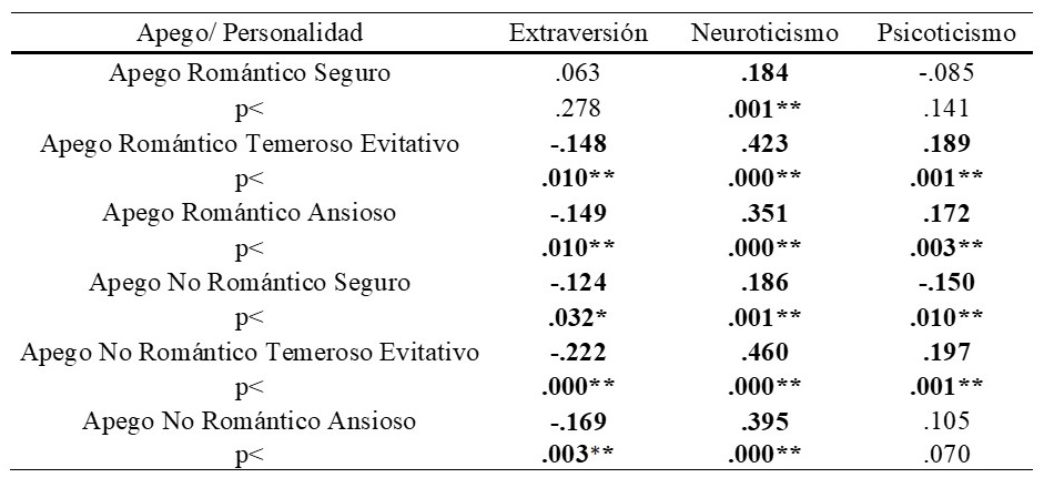 En la Tabla I se observan las correlaciones obtenidas: E correlacionó de manera inversa y débil con los apego romántico temeroso evitativo y ansioso y, con los apego no romántico seguro, temeroso evitativo y ansioso; N se correlacionó de manera positiva y débil con los apego romántico seguro, ansioso y el apego no romántico seguro. De manera positiva y moderada con los apego romántico y no romántico temeroso evitativo y, el no romántico ansioso; P correlacionó de manera inversa y débil con el apego no romántico seguro y, de manera positiva y débil con los apego romántico temeroso evitativo y ansioso y, con el apego no romántico temerosos evitativo.