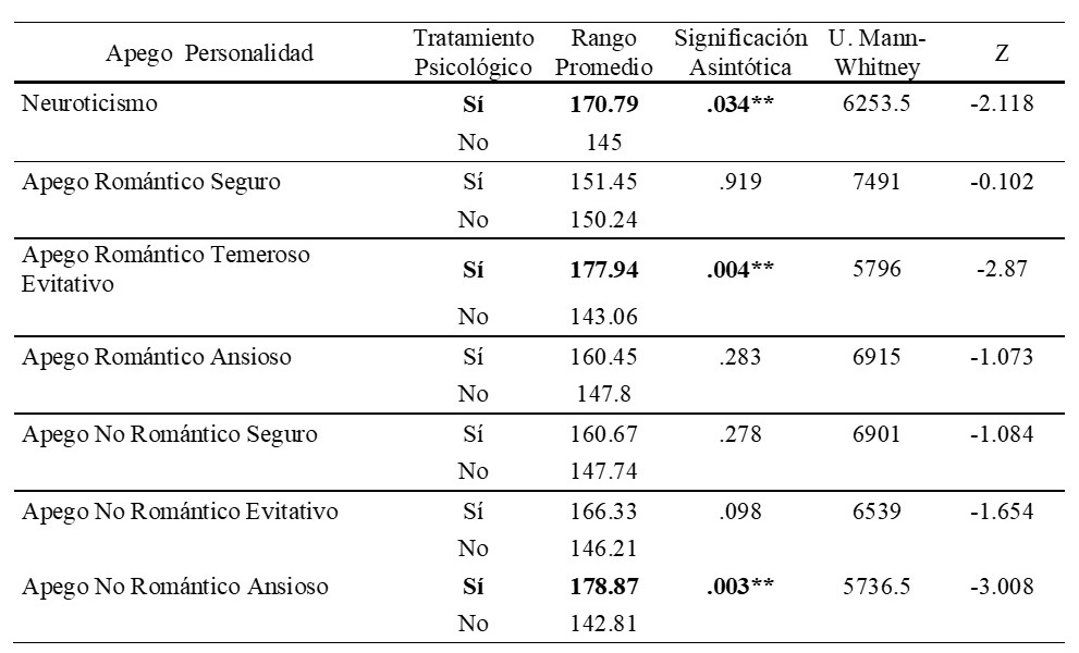 En la Tabla II se brinda una síntesis de los resultados de la variable actualmente en tratamiento psicológico como variable de agrupación, en donde la variable Neuroticismo y los estilos de apego funcionan como variables dependientes; se observó un predominio en N, apego romántico temeroso evitativo y, apego no romántico ansioso en personas que realizaban psicoterapia.