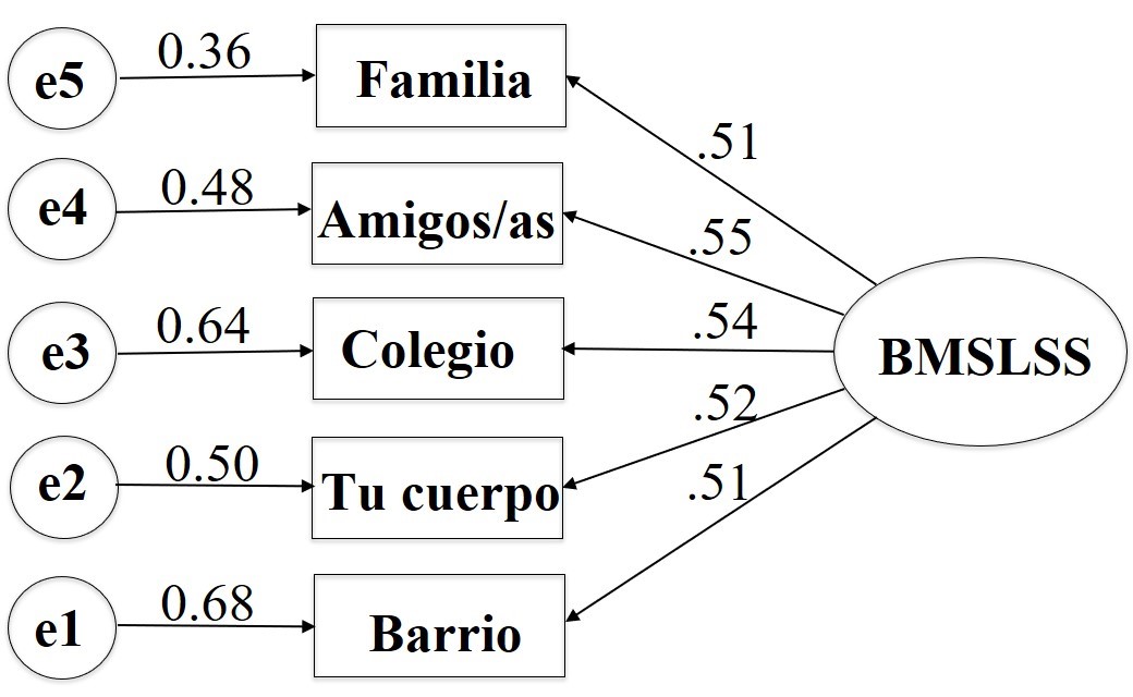 En la Tabla 3 se presentan las correlaciones entre los ítems y el puntaje total de la escala BMSLSS. Se puede indicar que de manera general los ítems correlacionan satisfactoriamente entre ellos y en la dirección esperada. En este punto, se analizaron también las correlaciones entre cada ítem y el puntaje total de la BMSLS. El rango de correlaciones entre los cinco ítems y el puntaje total de la BMSLSS es alto (.56 y .69), por tanto, se considera que la asociación entre las variables es relevante debido a su cercanía. Finalmente, se puede indicar que la correlación de cada uno de los ítems con el puntaje total de la BMSLSS es significativa al 99% de confianza.
