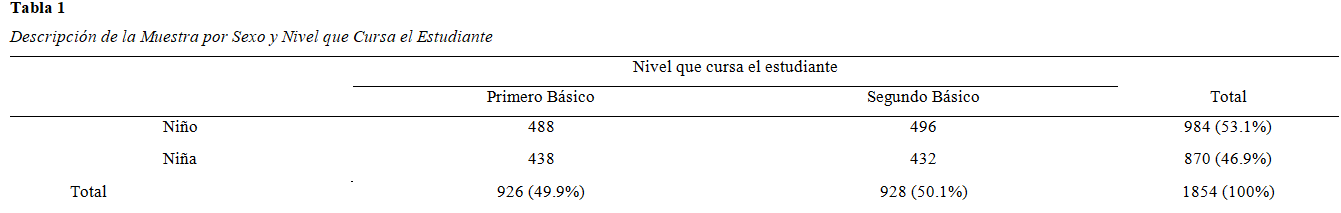 indica la composición de la muestra de acuerdo con el sexo y nivel que cursa el estudiante. Se indica que la muestra estuvo constituida por la totalidad de 1854 estudiantes, mayormente niños, correspondientes casi en igual número a primero y segundo básico. Además, la muestra obtuvo un promedio de edad de 7.35 años (DE = 0.66). Se consideraron 57 colegios particulares subvencionados (50.9%), 42 colegios municipales (37.5%) y 13 colegios particulares pagados (11.6%).