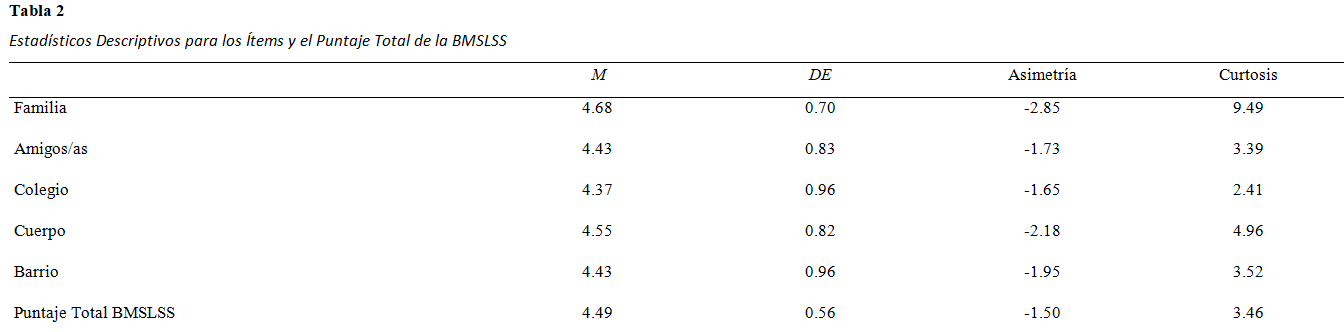 Para analizar la escala BMSLSS, primeramente, se examinó la distribución de las respuestas, evaluando la normalidad de cada uno de los ítems de la escala. Para esto, se examinaron las características de cada uno de los ítems y el puntaje total de la BMSLSS, dando cuenta de la asimetría, curtosis, media y desviación estándar en cada uno de los ítems.