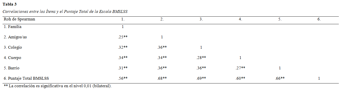 Correlaciones entre los Ítems y el Puntaje Total de la Escala BMSLSS