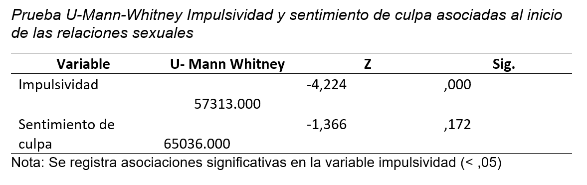 Prueba U-Mann-Whitney Impulsividad y sentimiento de culpa asociadas al inicio de las relaciones sexuales