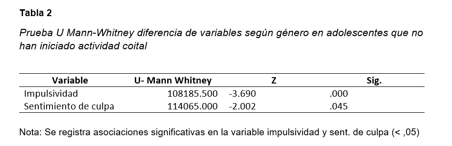 Cómo se observa en la TABLA 2 se registran diferencias estadísticamente significativas de la impulsividad y sentimiento de culpa según género en el grupo de adolescentes que no han iniciado actividad coital, se precisa que el promedio de impulsividad de los varones es mayor (M=51.92) que de las mujeres (M= 48,52), en tanto que en el sentimiento de culpa, se da el fenómeno inverso, donde el promedio de las mujeres es mayor (M=118.70) que el de los varones (M=99,14)