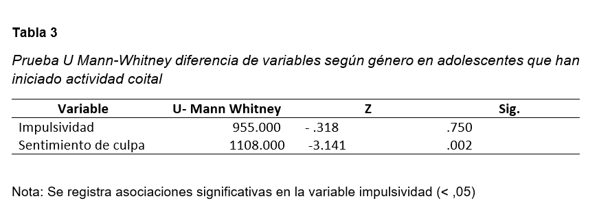 En la tabla 3 se registran diferencias estadísticamente significativas del sentimiento de culpa según género en el grupo de adolescentes que han iniciado actividad coital. El promedio de sentimiento de culpa en las mujeres (M=103.70) es mayor que en los varones (M=101.30)