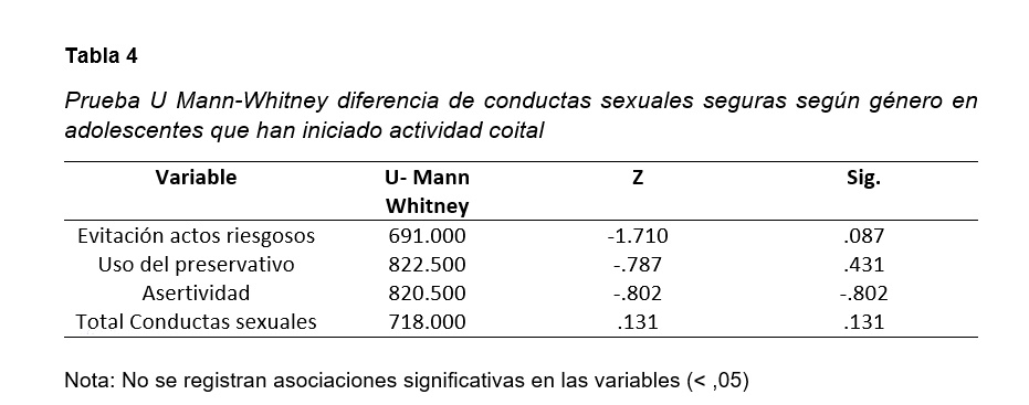 Finalmente, como se muestra en la tabla 4, en el grupo de adolescentes que han iniciado actividades sexuales coitales, se evidencia una diferencia, según género, en la emisión de conductas sexuales seguras.