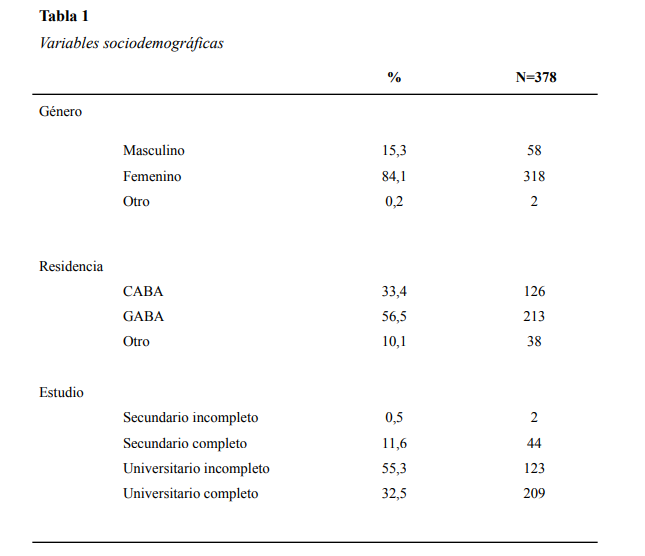 Para la realización del estudio, se reclutaron 378 (Tabla 1) participantes residentes en Ciudad Autonoma de Buenos Aires y Gran Buenos Aires. El estudio fue realizado recolectando muestra de manera online. La muestra se constituye en 318 participantes del género femenino (84,1%) y 58 del género masculino (15,3%) con una media de (x? = 33,27) y un desvío de (SD = 13,23).