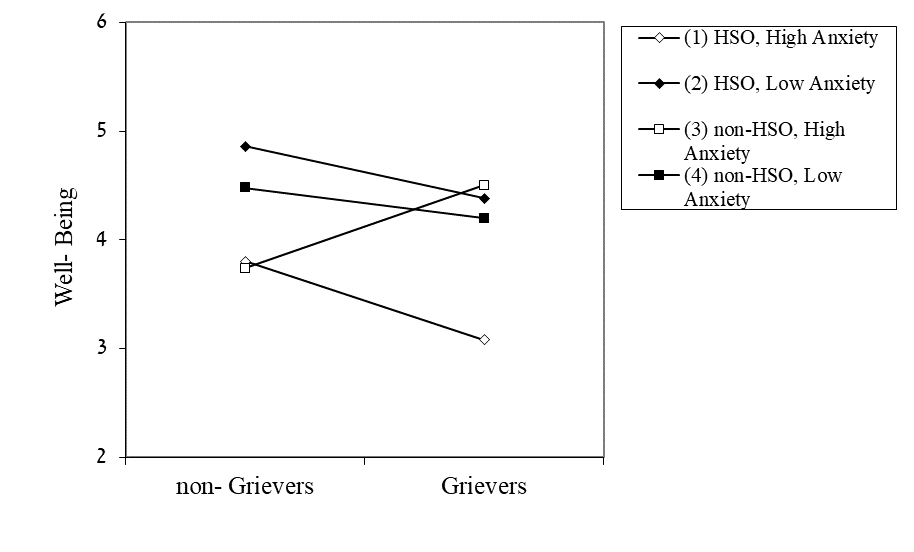 In testing the study’ prediction, Simple Slope Effects tests revealed that grieving participants reported lower well-being than non-grievers only if they were HSO and scored relatively high on attachment anxiety (+1 SD), b = -.36, SE = .13, t = -2.75, p = .006. However, among non-HSO who scored relatively high on attachment anxiety (+1 SD), grieving participants reported higher well-being than non-grievers, b = .34, SE = .14, t = 2.48, p = .014. Among HSO or non-HSO who scored relatively low on attachment anxiety, grieving participants did not significantly differ from non-grievers in well-being, bs < -.24, all ps > .070. As can be seen in Figure 1, the lowest level of well-being was reported by HSO who were grieving a parent’s death and scored high on attachment anxiety. But unexpectedly, non-HSO who scored high on attachment anxiety seemed to benefit (heightened well-being) from the death of a parent.