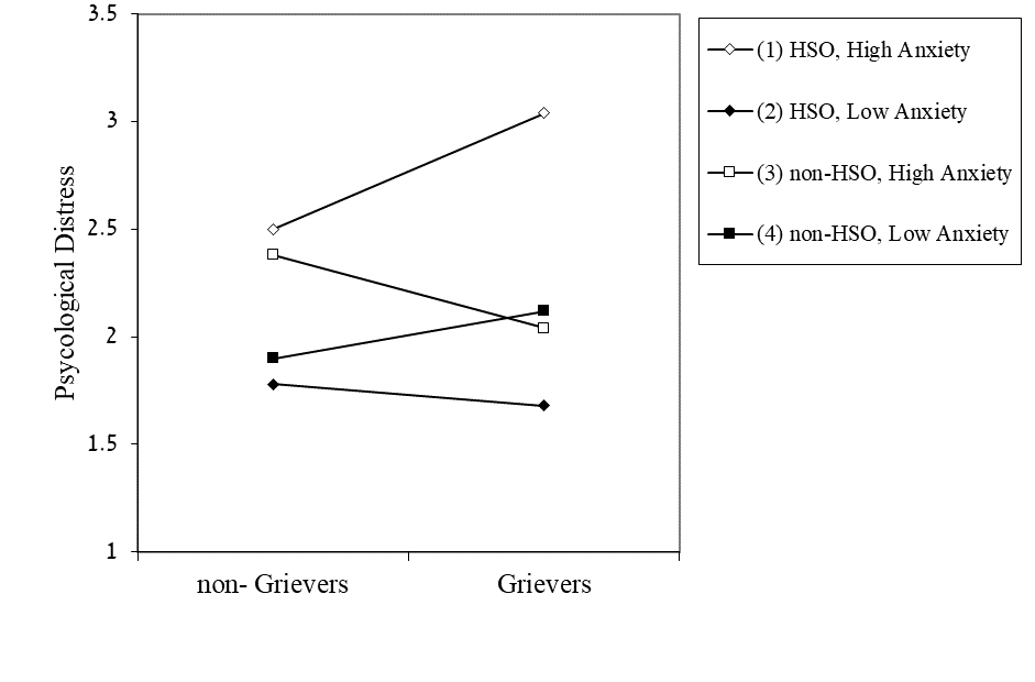 Simple Slope Effects tests revealed that that grieving participants reported higher distress than non-grievers only if they were HSO and scored relatively high on attachment anxiety (+1 SD), b = .25, SE = .11, t = 2.33, p = .021. Among non-HSO who scored relatively high on attachment anxiety (+1 SD) or among HSO or non-HSO who scored relatively low on attachment anxiety, grieving participants did not significantly differ from non-grievers in distress, bs < .14, all ps > .208. As can be seen in Figure 2, the highest level of distress was reported by HSO who were grieving a parent’s death and scored high on attachment anxiety.