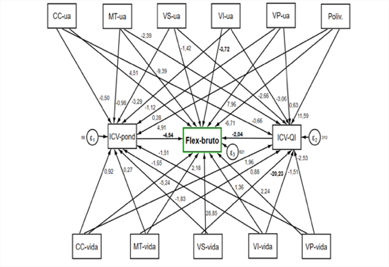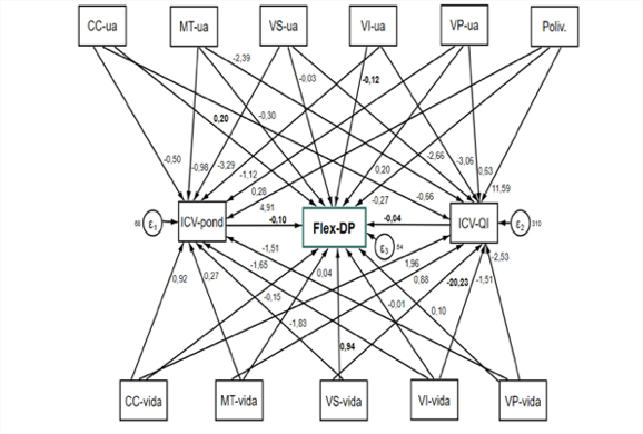 Quanto a flexibilidade desvio padrão (Figura 1b) resultados semelhantes foram encontrados, mostrando efeito direto da violência indireta no último ano para flexibilidade e também efeito direto entre o ICV ponderado e flexibilidade. Também verificou efeito direto da violência sexual ao longo da vida e flexibilidade e crimes convencionais ao longo da vida e flexibilidade. O caminho completo entre a violência sexual ao longo da vida ao ICV-QI e à flexibilidade (variável dependente) foi significativo. Assim, verificou-se associação entre VSV e ICV-QI e associação entre violência sexual ao longo da vida e ICV-QI e flexibilidade bruto. Esse resultado indica que o ICV-QI medeia os efeitos da violência sexual ao longo da vida na flexibilidade, ou seja, a compreensão verbal minimiza os efeitos da violência sexual ao longo da vida na flexibilidade. Ainda, indica que a violência indireta no último ano, violência sexual na vida e maus tratos no último ano contribuem diretamente para explicar a variação na flexibilidade das crianças, independente da compreensão verbal em crianças.