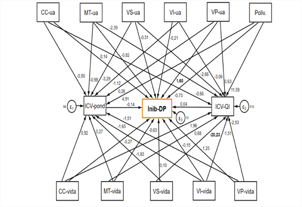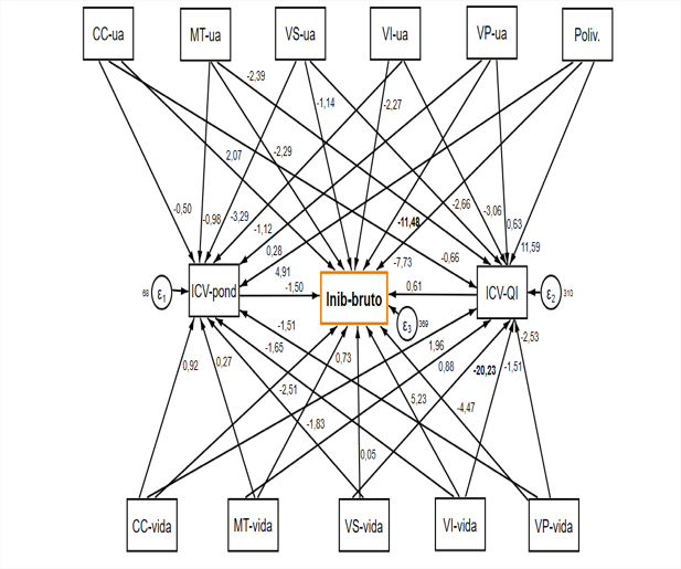 Quanto a inibição bruto (Figura 1c) verificou-se efeito direto da violência por pares no último ano para inibição bruto, mas não efeito direto entre o ICV-ponderado e inibição. Também verificou efeito direto da violência sexual ao longo da vida e ICV-QI mas não se verificou associação entre ICV-QI e inibição. Esse resultado indica que o ICV-QI e ICV ponderado não mediam os efeitos de nenhum tipo de violência na inibição em crianças, ou seja, a compreensão verbal não influencia os efeitos de nenhum tipo de violência na inibição bruto. Também, indica que a violência por pares interfere diretamente a inibição-bruto em crianças e que a violência sexual ao longo da vida interfere no ICV-QI nessa população.