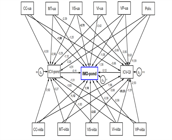 Quanto ao IMO ponderado (Figura 1E) o resultado mostrou efeito direto dos crimes convencionais no último ano para IMO; efeito direto da violência sexual no último ano e IMO e ; MTV e IMO. Também verificou efeito direto da VSV e ICV-QI, mas não entre ICV ponderada. Esse resultado indica que o ICV-QI e ICV-ponderado não mediam os efeitos de nenhum tipo de violência no IMO-ponderado em crianças. Também, indica que crimes convencionais e violência sexual no último ano, crimes convencionais, maus tratos e violência sexual a longo da vida contribuem diretamente para explicar a variação da IMO ponderado em crianças e que a violência sexual ao longo da vida contribui para explicar a variação do ICV-QI nessa população.