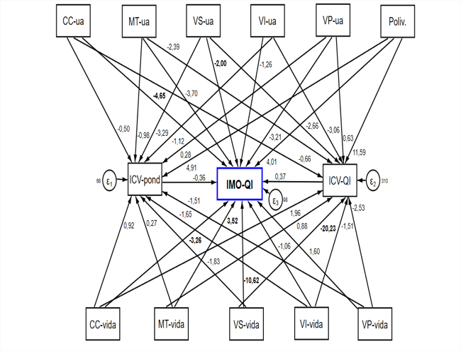 Quanto ao IMO QI (Figura 1f) o resultado mostrou efeito direto dos crimes convencionais no último ano para IMO-QI; efeito direto da violência sexual no último ano e IMO-QI ; CCV e IMO-QI; maus tratos ao longo da vida e IMO-QI; violência sexual ao longo da vida e IMO-QI. Também verificou efeito direto da violência sexual ao longo da vida e ICV-QI, mas não entre ICV-ponderado. Esse resultado indica que o ICV-QI e ICV-ponderado não mediam os efeitos de nenhum tipo de violência no IMO-QI em crianças. Também, indica que crimes convencionais, violência sexual no último ano, crimes convencionais e maus tratos e violência sexual ao longo da vida contribuem diretamente para explicar a variação da IMO QI em crianças e que a violência sexual na vida contribui par explicar a variação do ICV-QI nessa população.