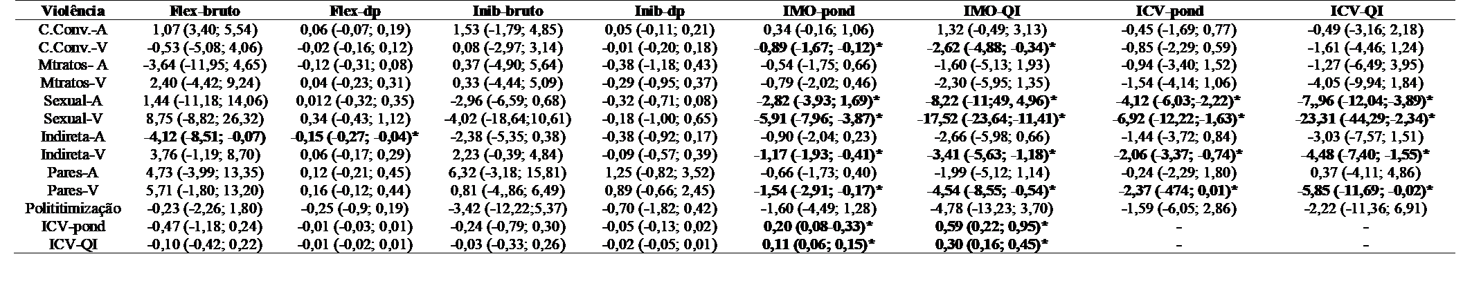 C Conv-A: Crimes convencionais último ano; C Conv-V: Crimes convencionais ao longo da vida; MTratos -A: maus tratos no útlimo ano; MTratos -V: maus tratos ao longo da vida; Sexual-A: violência sexual no último ano; Sexual V: violência sexual ao longo da vida; Indireta-A: violência indireta no último ano; Indireta-V:violência indireta ao longo da vidal; Pares-A: Violência por Pares no último ano; ParesV: violência por pares ao longo da vida. Nota=variáveis apresentadas como coeficiente de regressão (β) e IC95%. * significativo no nível de 0,0