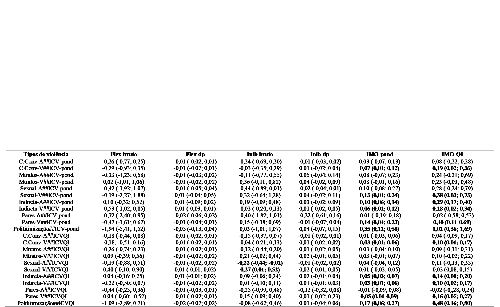 A Tabela 1 sintetiza os efeitos diretos dos tipos de violência (crimes convencionais, maus tratos, violência indireta, violência por pares e violência sexual) e o ICV nos domínios das FE, sendo eles flexibilidade, inibição e memória operacional em crianças. Mostra ainda o efeito direto dos tipos de violência na compreensão verbal.