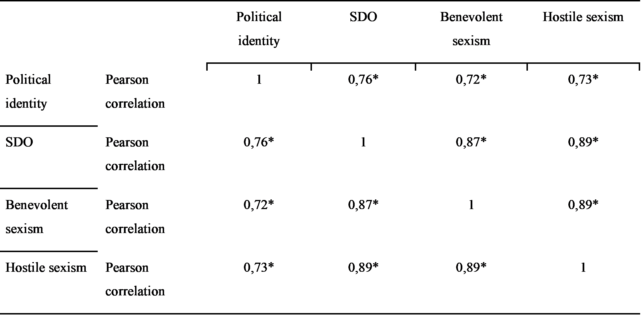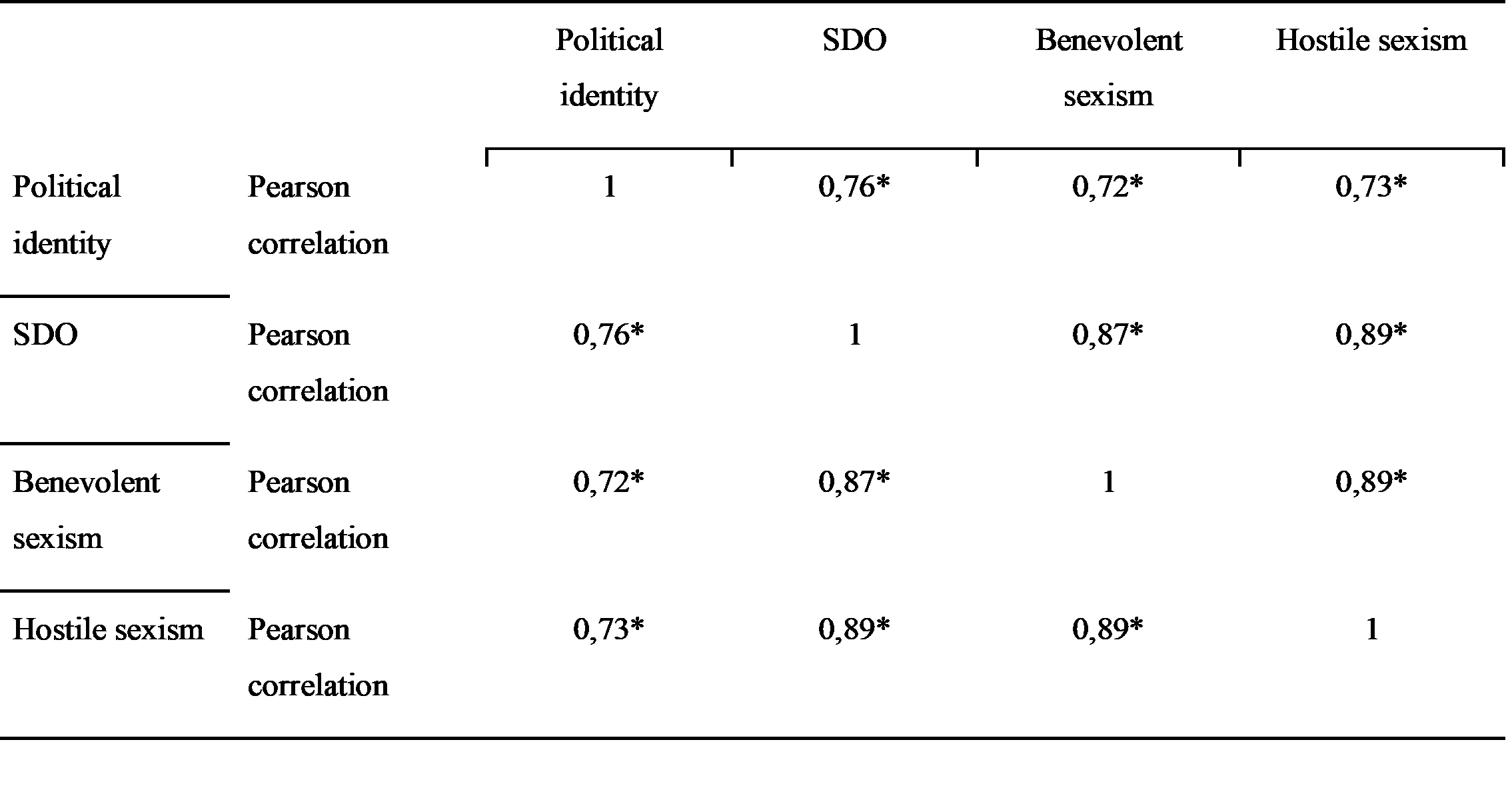 First, a Pearson correlation test was conducted to verify the relation between political identity, social dominance orientation, and ambivalent sexism. The results found can be seen in Table 1.