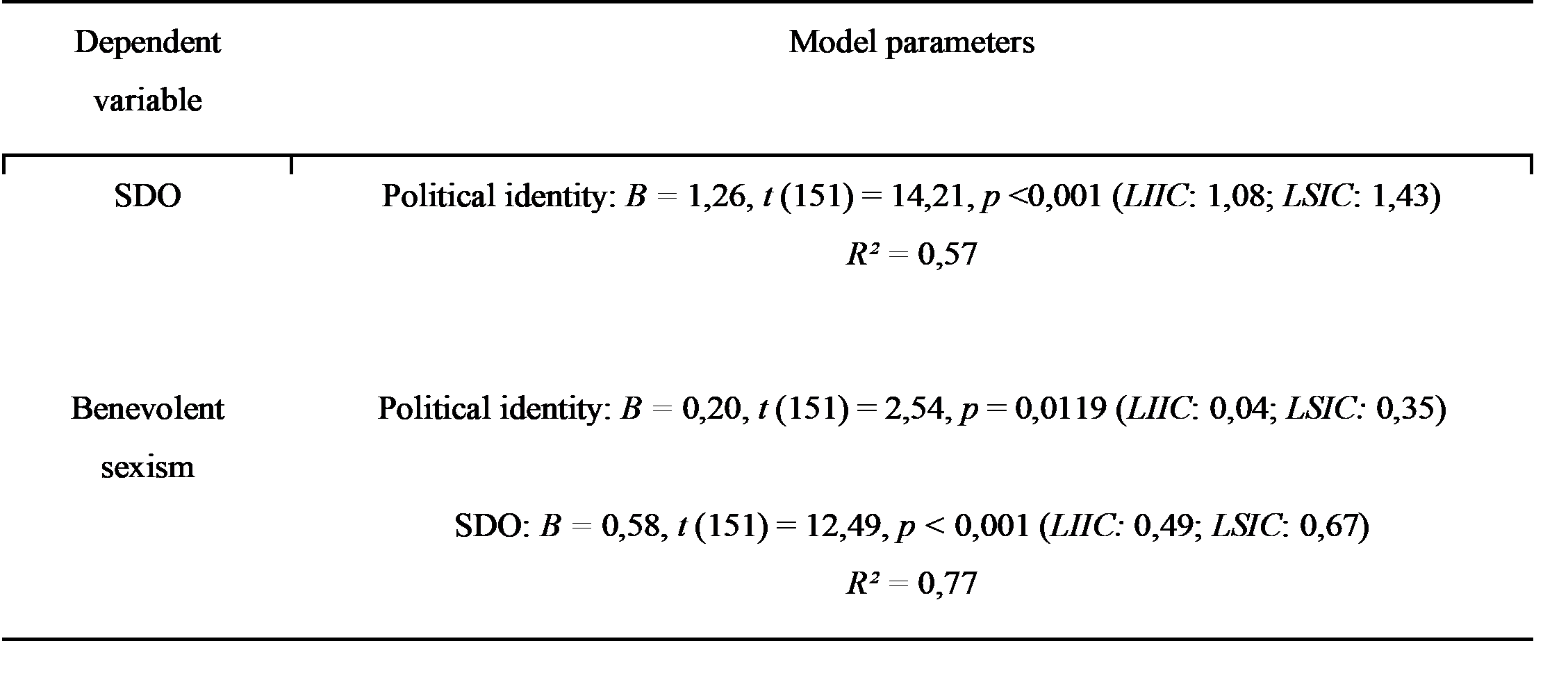Note. Indirect effect: B = 0,73, Boot SE = 0,09; BootLIIC = 0,55; BootLSIC = 0,90As described in Table 2, it is apparent that political identity predicts social dominance orientation. Similarly, both political identity and social dominance orientation predict benevolent sexism. Such results support the hypotheses of the mediation model and suggest that a right-wing political identity positively influences SDO, and a right-wing political identity also contributes to benevolent sexism rates. Additionally, SDO positively influences benevolent sexism rates and can be characterized as a mediation.