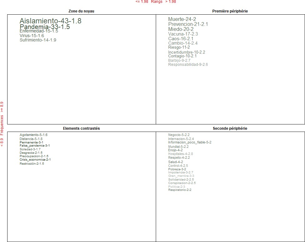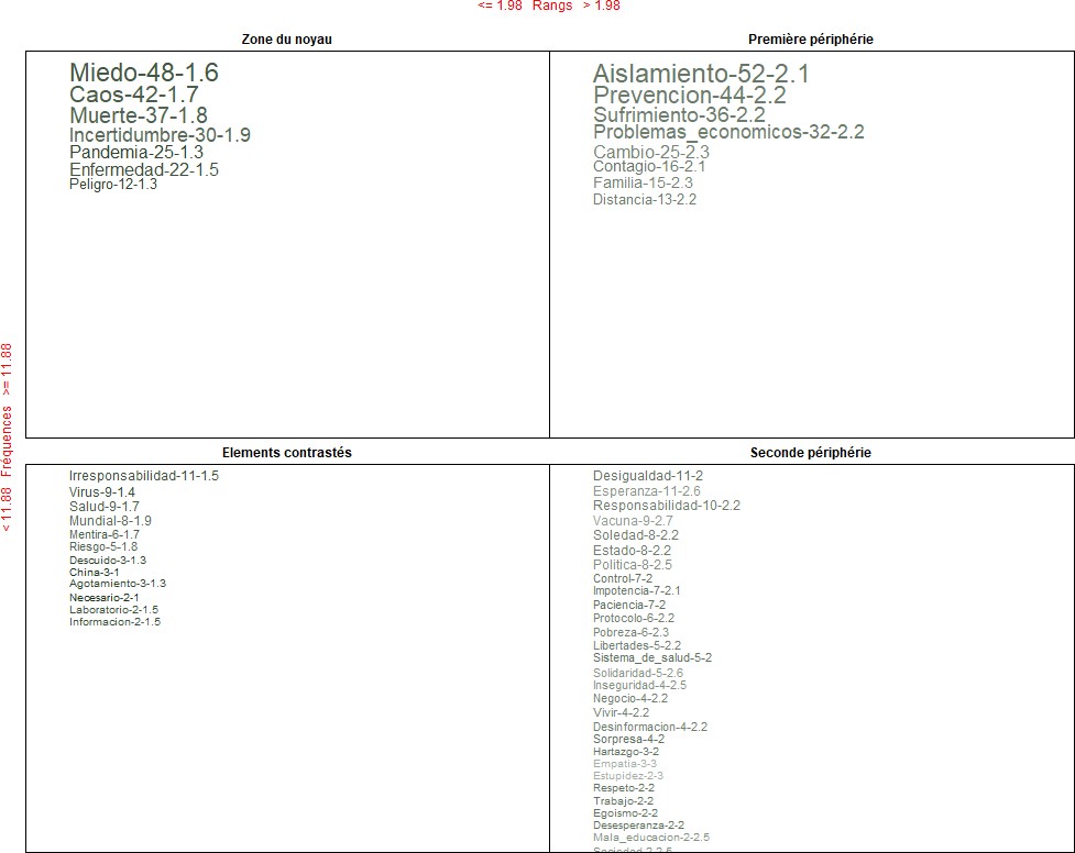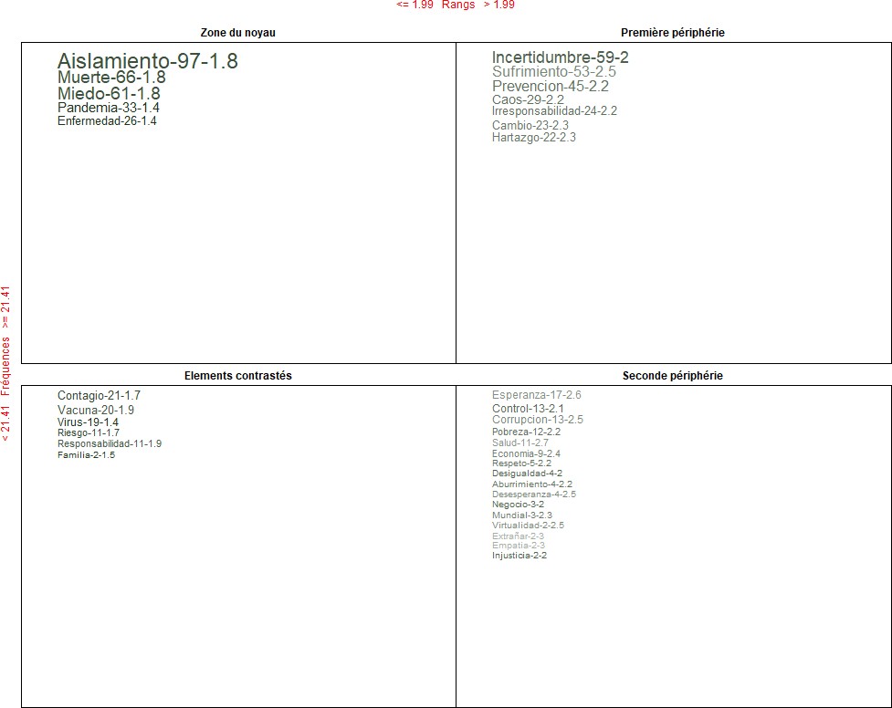 Cuadrante de cuatro casas RS sobre el COVID-19 (Tiempo 1) A partir de la distribución de las asociaciones, se obtuvieron los siguientes puntos de corte: frecuencia media = 11.88 y rango medio = 1.98. Sobre estos criterios se construyen los cuadrantes en función de “rango x frecuencia”. En el primer cuadrante superior izquierdo se encuentran los términos que obtuvieron un rango mayor o igual a 1.98 y la frecuencia intermedia mayor o igual a 11.88. En el superior derecho los que tienen un rango medio por debajo de los 1.98 y la frecuencia mayor o igual a 11.88. En el inferior izquierdo, aquellos con un rango alto mayor o igual a 1.98 y una frecuencia menor a 11.88. En el inferior derecho, se encuentran los que tienen un rango menor a 1.98 y una frecuencia menor a 11.88.Como se presenta en la Tabla 1, las ideas agrupadas en el cuadrante superior izquierdo (F>= 11,88; R<= 1,98) ligado con el núcleo central son: miedo, caos, muerte, incertidumbre, pandemia, enfermedad y peligro. En el cuadrante superior derecho (F>= 11,88; R> 1,98) ligado con la primera periferia se ubican las evocaciones de aislamiento, prevención, sufrimiento, problemas económicos, cambio, contagio, familia, distancia. Por último, en el cuadrante inferior izquierdo (F> 11,88; R<= 1,98) ligado con el grupo de contraste se ubican las evocaciones de irresponsabilidad, virus, salud, mundial, mentira, riesgo, descuido, China, agotamiento, necesario, laboratorio e información. Los sentimientos ligados a este primer advenimiento del COVID-19 plantearon miedo y caos predominantemente; mientras que, en relación con la primera periferia, se comenzaba a percibir la posibilidad de aislamiento con fines preventivos y lo que esta medida, en conjunto con el COVID-19, podría derivar como resultado. Por su parte, el grupo de contraste presenta mayor amplitud de ideas asociadas con el posible surgimiento del virus y con su propagación.
