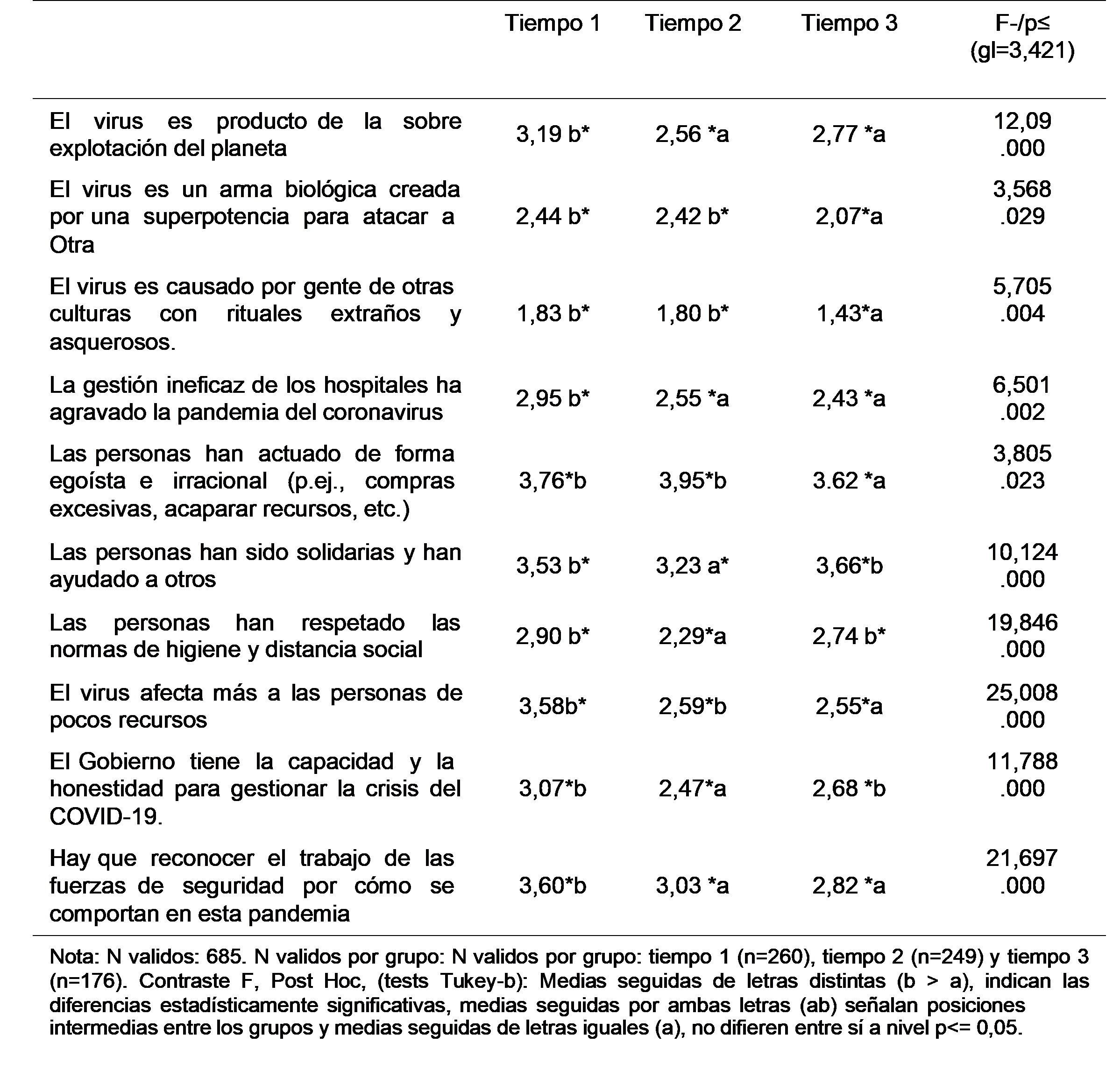 A su vez, el tiempo 1 y 2 se diferenciaron del tiempo 3, en la afirmación de que el virus es un arma biológica y en que es causado por gente de otras culturas con rituales extraños y asquerosos. A su vez, hay mayor percepción de que las personas han actuado de forma egoísta e irracional y en que el virus afecta más a las personas de pocos recursos.