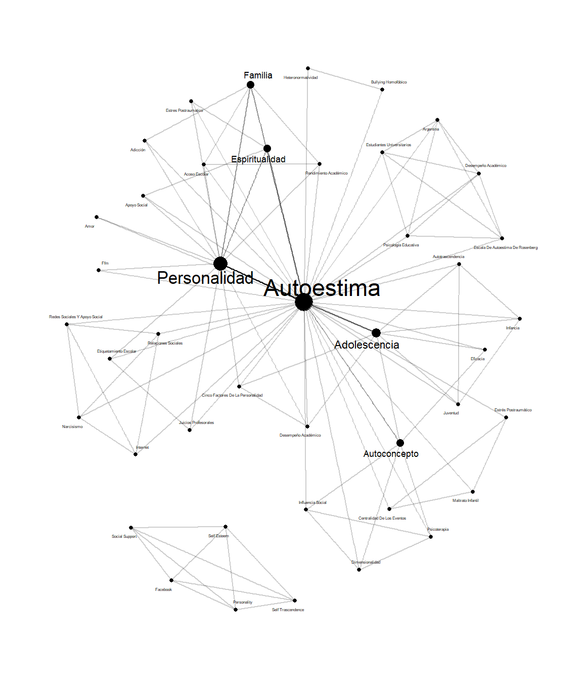 En los dos gráficos anteriores (Figs. 7 - 8), puede apreciarse que, además del propio término autoestima, se destacan personalidad, adolescencia, autoconcepto, familia y espiritualidad como las palabras clave más utilizadas. La relación más fuerte se da entre autoestima con personalidad, seguida por autoestima con adolescencia y con espiritualidad. Personalidad por su parte se conecta con más de 10 palabras claves también relacionadas con autoestima, si bien de modo menos pronunciado.