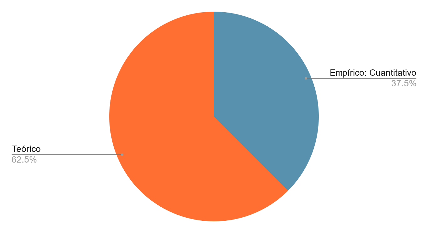 La mayoría de los artículos publicados han sido del tipo teórico (revisión bibliográfica, etc.). De todos modos aparece una proporción considerable del tipo empírico con metodología cuantitativa. Cabe señalar que no se hallaron trabajos empíricos a partir de una metodología cualitativa.