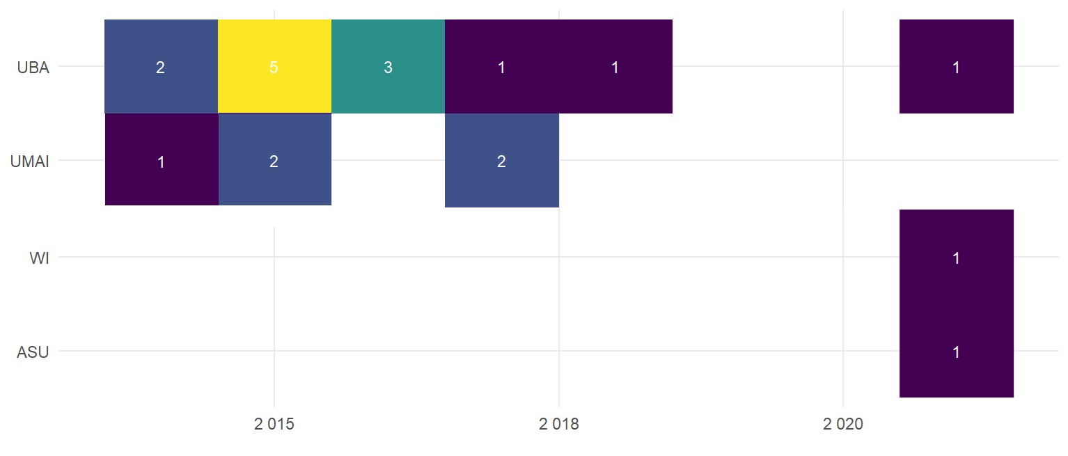 En lo que concierne a producción de artículos sobre autoestima por universidades, se destaca la Universidad de Buenos Aires (N=13), seguida por la Universidad Maimónides (N=5), ambas argentinas. Completan la lista 2 universidades norteamericanas, cada una con un artículo.