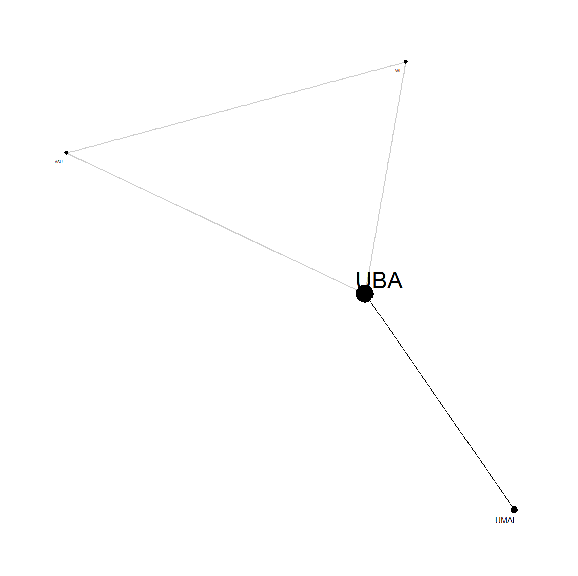Destacándose nuevamente, la Universidad de Buenos Aires, se ubica como en el centro de la red de colaboraciones entre instituciones educativas, articulándose con todo el resto de las universidades. Se aprecia asimismo una colaboración entre las 2 universidades norteamericanas de la lista.