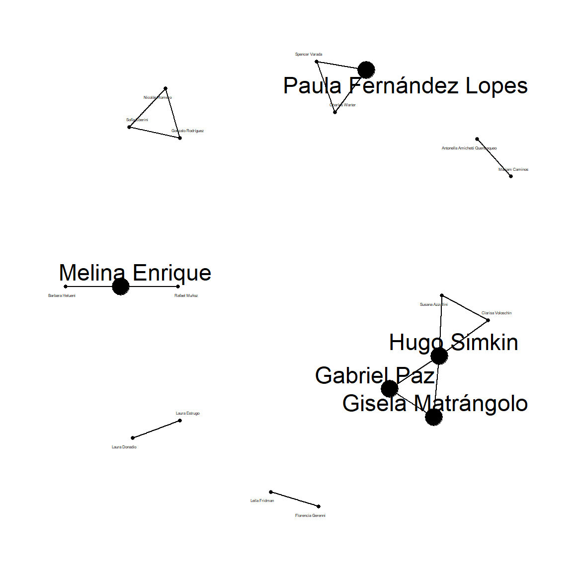Se observa en este gráfico (Fig. 6) la mayor densidad nodal entre Gabriel Paz, Hugo Simkin y Gisela Matrángolo. A su vez, también se destacan Melina Enrique y Paula Fernández Lopes, cada una por su parte con 2 colaboraciones propias. Por otro lado pueden observarse otras “islas” más pequeñas de colaboración entre autores de diferentes universidades, conformando en total 7 redes de colaboraciones.