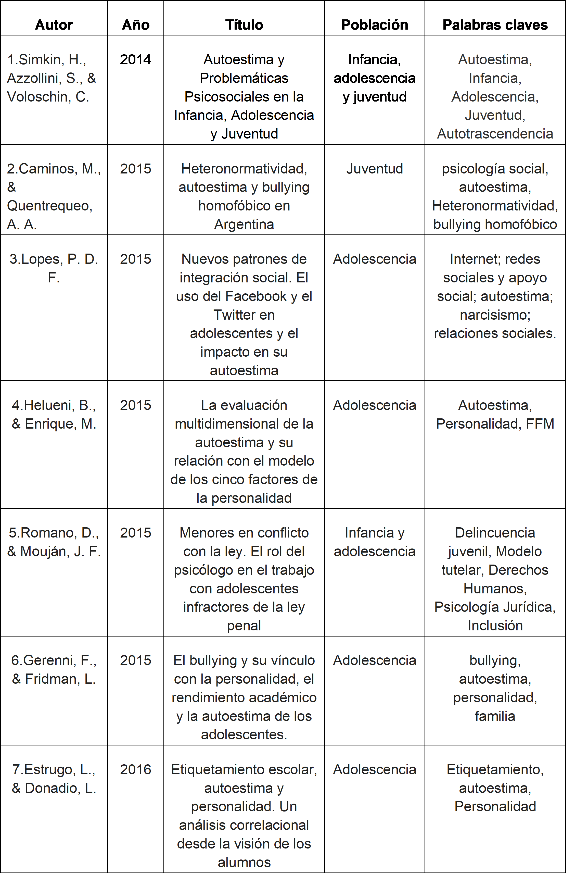 El análisis de las palabras clave revela una amplia diversidad de temas tratados en los estudios sobre infancia, adolescencia, juventud y adultos mayores. Entre las palabras claves recurrentes, se destaca en primer lugar autoestima, seguida de adolescencia, personalidad y redes sociales. Otros términos con cierta frecuencia son Familia, Infancia, Género, Varones y Masculinidades. Estos términos reflejan las áreas de mayor interés para la revista en las poblaciones seleccionadas durante el periodo estudiado, abarcando aspectos del desarrollo como la autoestima y la personalidad y aspectos con implicancias sociales como la familia, las redes y el género con un especial énfasis en las poblaciones de infancia y adolescencia. Se subraya que la infancia y la adolescencia fueron las etapas más vinculadas a la investigación sobre autoestima.