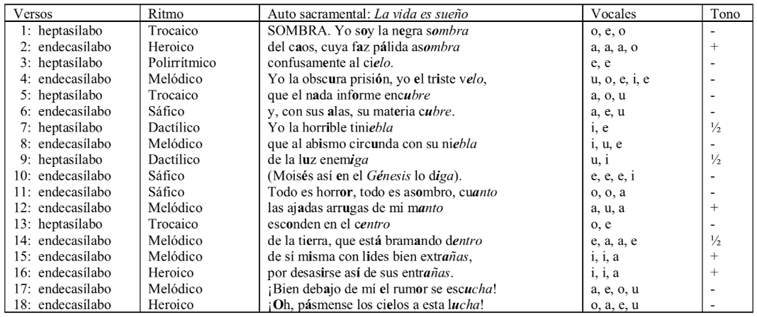 En los tres fragmentos aquí estudiados reina la oscuridad. En el primero, de 82 caracteres, 14 vocales se considerarían positivas (/a/ e /i/); 24 negativas (/e/, /o/ y /u/). Ocho serían las vocales positivas acentuadas gramaticalmente; prosódicamente, 6. Once de las vocales negativas serían acentuadas gramaticalmente; 5 prosódicamente. En el segundo fragmento, de 52 caracteres, las vo- cales positivas (/a/ e /i/) serían 14. Siete están acentuadas gramaticalmente, 2 prosódicamente. Las vocales negativas (/e/, /o/ y /u/) son 12, pero 9 están acentuadas gramaticalmente, 4 prosódicamente.