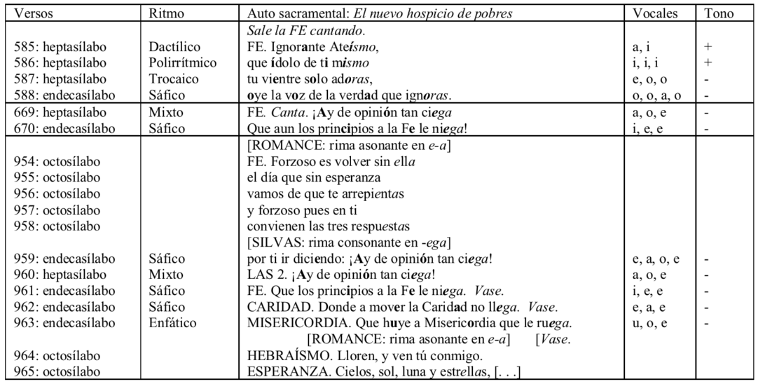 El tercer fragmento, de 146 caracteres, contiene 35 sílabas positivas (/a/ e /i/). Doce están acentuadas gramaticalmente; prosódicamente 4. Treinta y cinco son las vocales negativas (/e/, /o/ y /u/). De estas, 23 están acentuadas gramaticalmente, y 12 prosódicamente. Salvo en los dos primeros versos del primer fragmento (vv. 585-586), donde sobresalen rítmicamente las vocales positivas, en los demás versos el tono prosódico es negativo. Con la excepción de un endecasílabo enfático (el v. 963), predomina en estos versos el ritmo sáfico (en los vv. 588, 670, 959, 961 y 962 [5 vv.]), de lento y majestuoso ritmo. Los heptasílabos, salvo uno trocaico (el v. 587), son de ritmo mixto (vv. 669 y 960 [2 vv.]), dactílico (el v. 585 [un v.) y polirrítmico (el v. 586 [un v.]). Este ritmo les da a estos versos cortos un tono lánguido y preclaro. La rima consonante pareada (aabB, aA), después vuelta monorrima de larga extensión (AaAAA), machaca la incesante negatividad de la primera sílaba acentuada, dejando la vocal más positiva en segundo término y en forma átona, para así su- gerir la derrota del bien y el triunfo del mal. Se ha de notar, a la vez, que las silvas de los dos últimos fragmentos irrumpen discursos en otros metros, el romance en este caso, imitando incluso el sonido de las vocales (e-a), aunque en forma consonante (-ega) y cantada, de las asonancias anteriores y subsiguientes del romance interrumpido. Las silvas añaden así ímpetu y variedad, por su longitud y cambio, a un metro de extensión fija, rima inmutable y tono prosaico. Este tipo de incrustación sería, en la opinión de Fónagy (1996: 9), un tipo de hipérbaton. En el nivel del contenido, las figuras teológicas del bien—Fe, Caridad y Misericordia—exhortan, inútilmente, por eso la fustigación, a las leyes teológicas desplazadas—Ateísmo y Hebraísmo—que asistan a la boda del Hijo del Rey con la Sunamitis (la Naturaleza Humana). Aunque sabemos intelectualmente que las leyes anteriores rechazarán la invitación del Rey, el trasfondo fonético-sicológico anticipa y reitera precisamente ese desprecio.