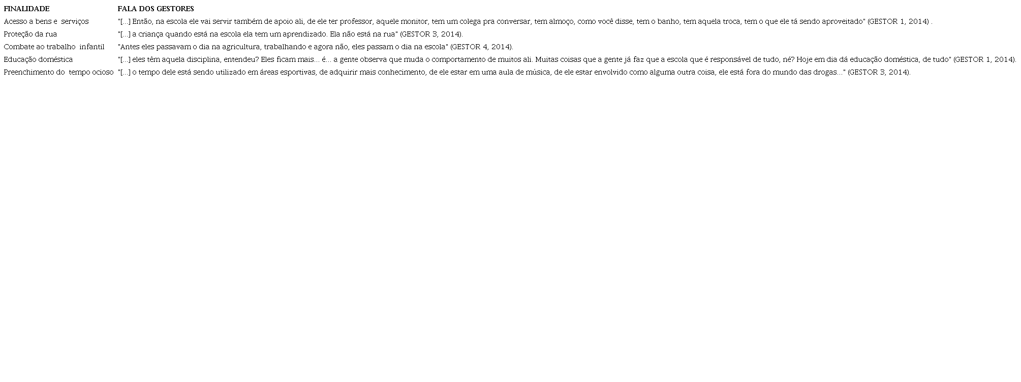 A valorização da escola é o resultado da forma como os gestores compreendem e subordinam a oferta escolar da educação (em tempo) integral defendida nos documentos às finalidades instituídas pelo contexto socioespacial do qual a escola faz parte e adotadas, particularmente, como de responsabilidade escolar. As finalidades relacionadas à educação (em tempo) integral identificadas foram: a) acesso a bens e serviços, b) proteção da rua; c) combate ao trabalho infantil; d) educação doméstica (disciplina); e) preenchimento do tempo ocioso. Observemos o quadro abaixo: