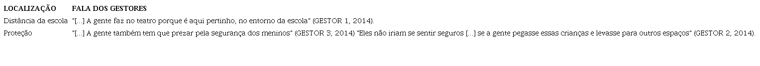 Para o critério localização, dois elementos são citados pelos gestores: a) distância da escola; b) proteção.