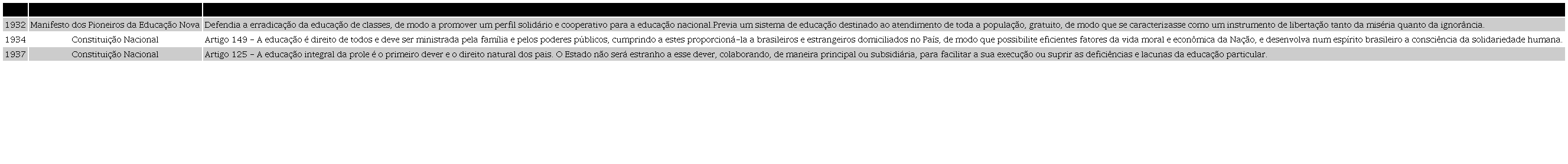 Pelo menos três importantes fatos podem ser apontados como meios de pensar e operacionalizar a educação nacional com interesses e maneiras completamente distintas na década de 1930. Destacamos a publicação do Manifesto dos Pioneiros da Educação Nova; a Constituição de 1934; e a Constituição de 1937. O quadro a seguir ressalta o que cada medida citada esperava implementar na educação do país: