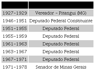 Gustavo Capanema teve uma extensa atuação no campo político, iniciando como vereador em 1927, em Pitangui-MG. Tomado por aspirações mais ousadas, seguiu a marcha para a conquista de espaço de maior representação e de poder, tendo sido eleito Deputado Federal Constitucional; Deputado Federal por cinco mandatos consecutivos; Senador por dois mandatos, concretizando uma longa jornada, como pode ser conferida no quadro a seguir: