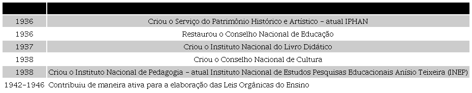 Neste quadro aparecem apenas algumas medidas iniciadas por ele. Capanema era um admirador da cultura nacional e demonstrava o interesse em valorizar, manter e resguardar os traços culturais do país em suas ações. Ao assumir a função de ministro propôs a inclusão do termo cultura na denominação do ministério, cuja renomeação foi negada mas, ainda assim,ele defendeu a perspectiva de criar órgãos para cuidar dos assuntos culturais do Brasil. Esta temática foi pautada no “Programa e planos de ação do ministério”, elaborado em 1935, destacando que: