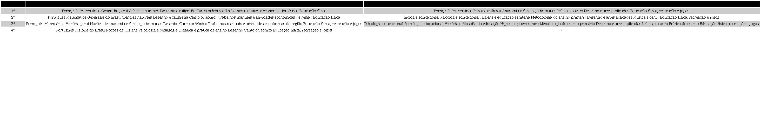 Conforme o Decreto que reformou o ensino normal, era finalidade deste: promover a formação docente aos professores das escolas primárias; habilitar os administradores escolares e propagar o conhecimento necessário a educação da infância (BRASIL, 1946). Para tanto, dividia a formação em dois ciclos:“O primeiro dará o curso de regentes de ensino primário, em quatro anos, e o segundo, o curso de formação de professores primários, em três anos” (BRASIL,1946).Tais cursos eram compostos pelas disciplinas dispostas no quadro abaixo: