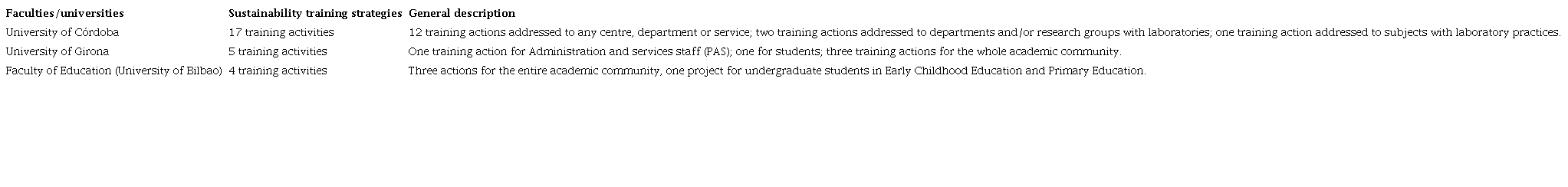 Considering the practically total absence of data that included training for sustainability in the Spanish public faculties of educational sciences, our constructive results begin with the University of A Coruña, which in 2014 signed a collaboration agreement with the Foundation for Environmental Education for the implementation of ecological management procedures under the green flag Green-Campus. As far as the Faculty of Education Sciences is concerned, we find the loan programme to promote the use of bicycles as a sustainable mobility vehicle, resolved on September 2020, by which 70 bicycles were loaned, and the recognition of the most sustainable final degree projects in the Faculty of Education held in 2017, and the call for applications on 26 October 2020. There are various guides, campaigns, programmes, catalogues, news, photos... undated or prior to our date of study. Everything suggests that in this faculty there would be training for sustainability, but the fact that the last action plan collected is for the biennium 2017-2019, together with the totality of data from the previous analysis, makes it impossible for us to confirm it (FACULTAD DE CIENCIAS DE LA EDUCACIÓN. UNIVERSIDAD DE A CORUÑA, 2020).