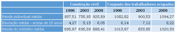 A Tabela 1 demonstra esta defasagem quanto ao rendimento médio individual dos trabalhadores da construção civil em relação ao conjunto dos trabalhadores ocupados, à época do período pesquisado.