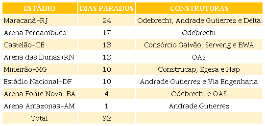 No Brasil, no entanto, essa pressão parece favorecer também às próprias empreiteiras, uma vez que contribuiu para os atropelos legais, aportes adicionais de recursos públicos, irregularidades nos processos de licenciamento de obras e inconsistência e incompletude de alguns projetos licitados sem qualquer segurança econômica, ambiental e jurídica. [...] Mais que isso: serviu como pretexto para as violações de direitos dos trabalhadores nas obras dos estádios e dos projetos de infraestrutura. A conjugação entre a magnitude das obras e os cronogramas supostamente apertados para realizar os empreendimentos já tem resultado em más condições de trabalho e na superexploração dos operários, a despeito das cifras milionárias destinadas às obras. [...] Constitui-se um paradoxo perverso e evidente: cerca de 50% dos recursos destinados aos empreendimentos provém do Banco Nacional de Desenvolvimento Econômico e Social (BNDES) e da Caixa Econômica Federal (CEF), com utilização de recursos provenientes do Fundo de Amparo ao Trabalhador (FAT). E são nessas obras que são constatadas violações de direitos trabalhistas.