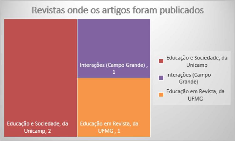 Sobre as revistas que os artigos foram publicados destacou-se a revista Educação e Sociedade, da Unicamp, com duas publicações, Interações (Campo Grande) e Educação em Revista, da UFMG com uma publicação cada. Como segue, o gráfico abaixo: