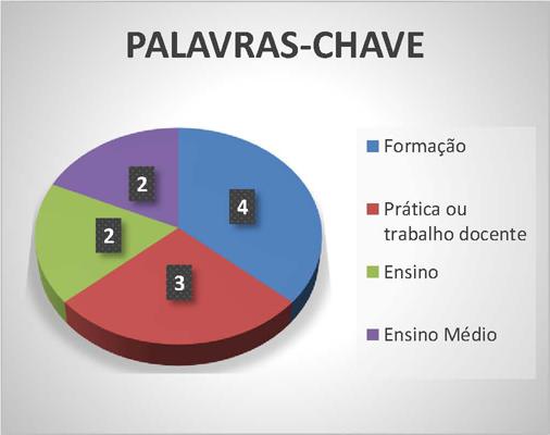 Buscando uma melhor visualização das palavras-chaves encontradas nos quatro artigos selecionados, optou-se por um gráfico dos termos com maior recorrência. Observe abaixo no gráfico 2 que a palavra-chave Formação apareceu quatro vezes, sendo acompanhada pelos termos: inicial, continuada, docente e de professores, os outros descritores com maior ocorrência foram Prática docente/Trabalho docente, Ensino Médio e Ensino.