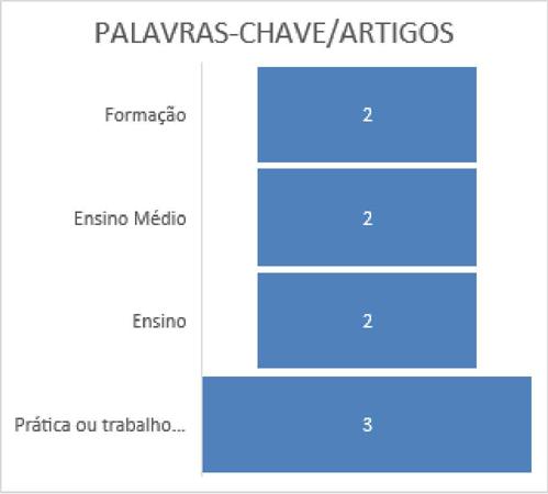Nota-se que o termo Ciências Humanas não aparece entre as palavras-chaves dos artigos selecionados. Atribui-se a esta ausência a mudança no momento da pesquisa na plataforma Scielo, onde o descritor foi retirado da busca e aplicado através do filtro de pesquisa, sendo filtradas pesquisas na área de Ciências Humanas. Outra observação relevante é o fato do descritor formação docente, que entre as palavras-chaves revela-se como o mais recorrente, no entanto, dividido entre várias combinações junto à palavra formação, sendo importante descrever que mesmo com maior frequência, ela aparece em apenas dois dos quatro artigo, como mostra o gráfico 3. Entre as palavraschaves com maior ocorrência nos artigos aparece prática ou trabalho docente, que se apresenta em três dos quatro artigos. Os outros descritores com maior frequência são ensino médio, ensino e formação. Quando comparamos os gráficos 3 e 4 observamos que apenas o termo formação difere de quantidade de ocorrências para quantidade de artigo onde se repetem, isso ocorre porque a palavra formação manifesta-se no artigo de Freitas e Pacífico (2020) em três combinações diferentes, como: formação docente, formação continuada e desafios da formação.