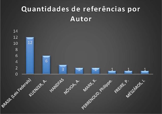 Como não poderia ser diferente em uma pesquisa que trata da formação docente, a principal referência dos artigos selecionados foram as leis federais relacionadas à educação, que foram referenciadas doze vezes em quatro dos cinco artigos. Quando se refere a um autor, Kuenzer (2011), foi o mais reportado com seis registros, no entanto é válido mencionar que Kuenzer aparece em apenas um artigo. Para facilitar a exposição desta lista de autores e aparições nos textos, foi elaborado o gráfico abaixo: