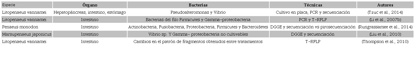 En el caso de camarones peneidos, estudios recientes han detectado centenares de especies de bacterias pertenecientes a taxones asociados con ambientes marinos y terrestres (Rungrassamee et al., 2014; Vargas-Albores et al., 2017b); lo que lleva a asumir que, al igual que en los mamíferos, la biología de los camarones peneidos está fuertemente ligada a la microbiota asociada a su tracto digestivo.